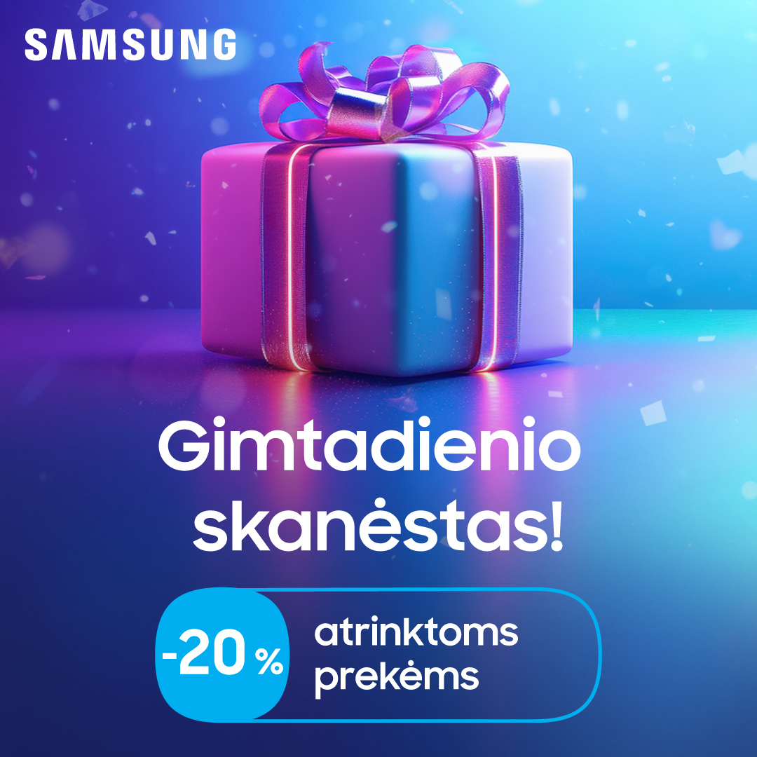 Samsung gimtadienio skanėstai jau čia! Pasilepinkite iki -20% nuolaidomis atrinktoms prekėms – nuo telefonų ir planšečių iki televizorių, ausinių, buitinės technikos ir dar daugiau!