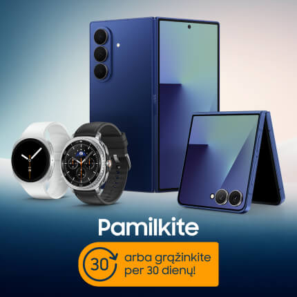 „Samsung“ parduotuvėse išbandykite naujienas be streso – įsigykite „Galaxy Flip7“, „Fold7“, „Galaxy Watch8“ arba „Watch8 Classic“ ir turėkite net 30 dienų apsispręsti. Jei nepatiks – grąžinkite ir atgaukite pinigus! Akcija galioja iki 2025 09 28 perkant nurodytus modelius „Samsung" parduotuvėse, galima grąžinti per 30 kalendorinių dienų nuo pirkimo datos. Plačiau teiraukitės parduotuvės eksperto.