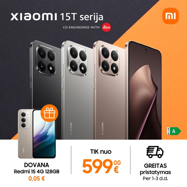 - Xiaomi 15T 256GB – tik 599 Eur + Dovana: Redmi 15 128GB telefonas