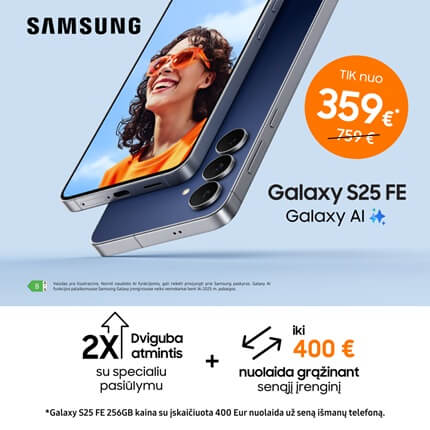 *Makete nurodyta Samsung Galaxy S25 FE 256GB telfono kaina su įskaičiuota 400 Eur nuolaida už seną išmanų įrenginį. Nuolaidos suma priklauso nuo grąžinamo įrenginio modelio ir būklės.