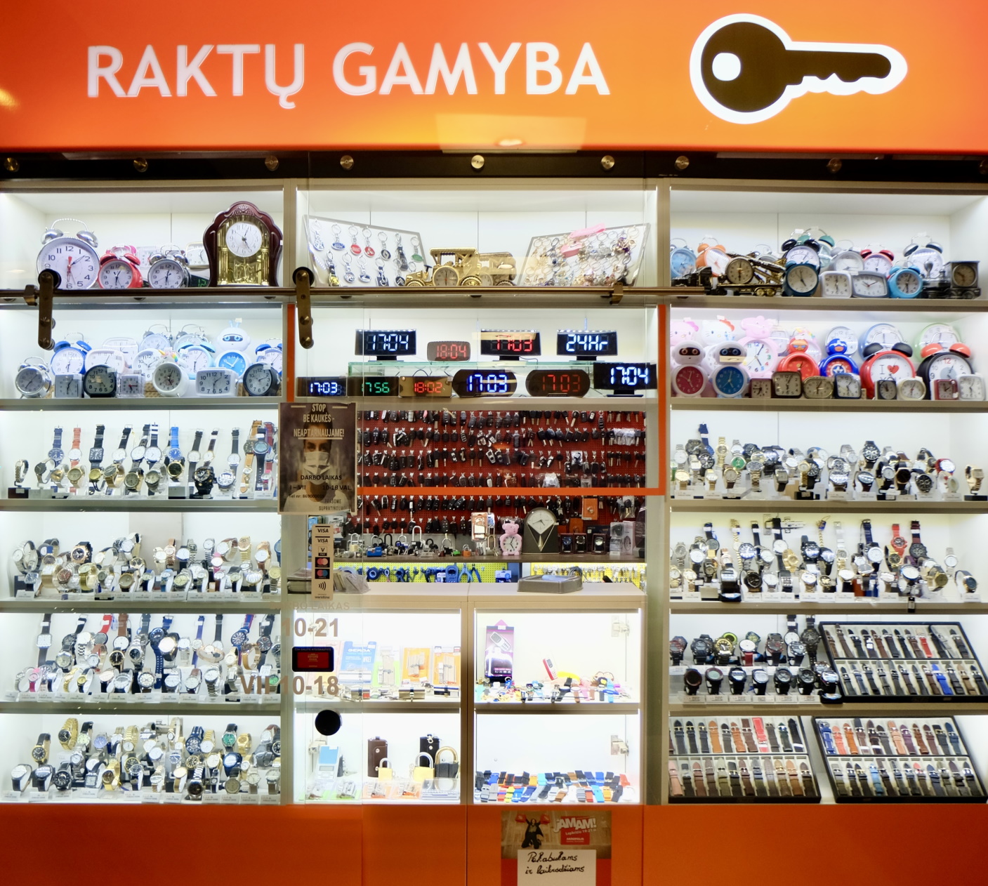 Raktų gamyba ir programavimas, elementų keitimas, laikrodžių dirželių ir apyrankių keitimas, laikrodžių taisymas ir pardavimas.