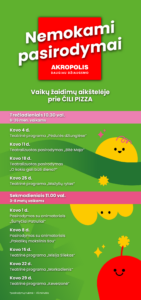 Nuotraukoje ir (ar) vaizdo įraše gali būti užfiksuotas Jūsų (Jūsų vaiko) atvaizdas, kurį PPC AKROPOLIS gali naudoti viešai komunikacijai, įskaitant paskelbti AKROPOLIS interneto svetainėje, socialinių tinklų paskyrose ir/ar kituose viešuose pranešimuose. Daugiau apie asmens duomenų tvarkymą www.akropolis.lt