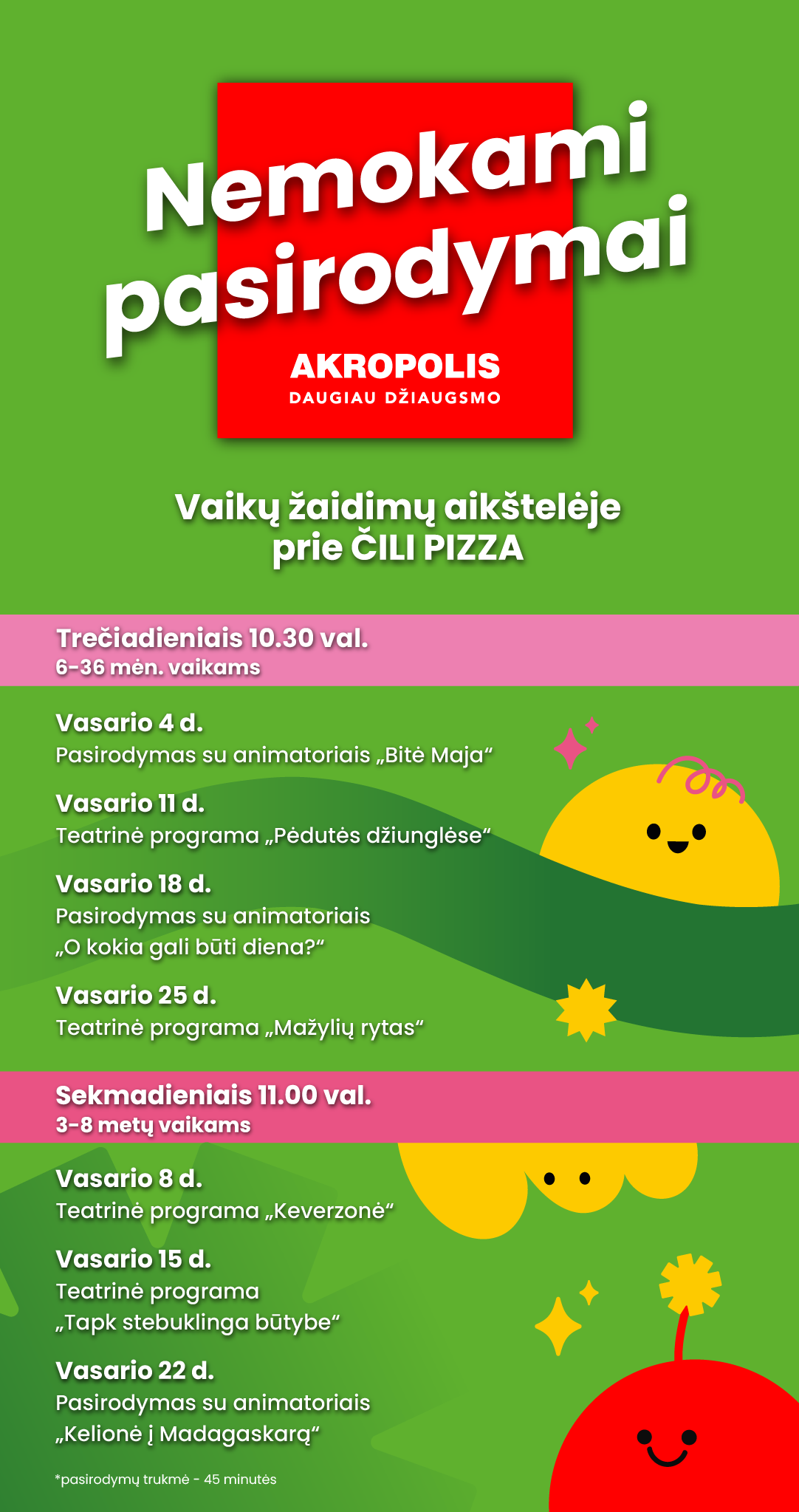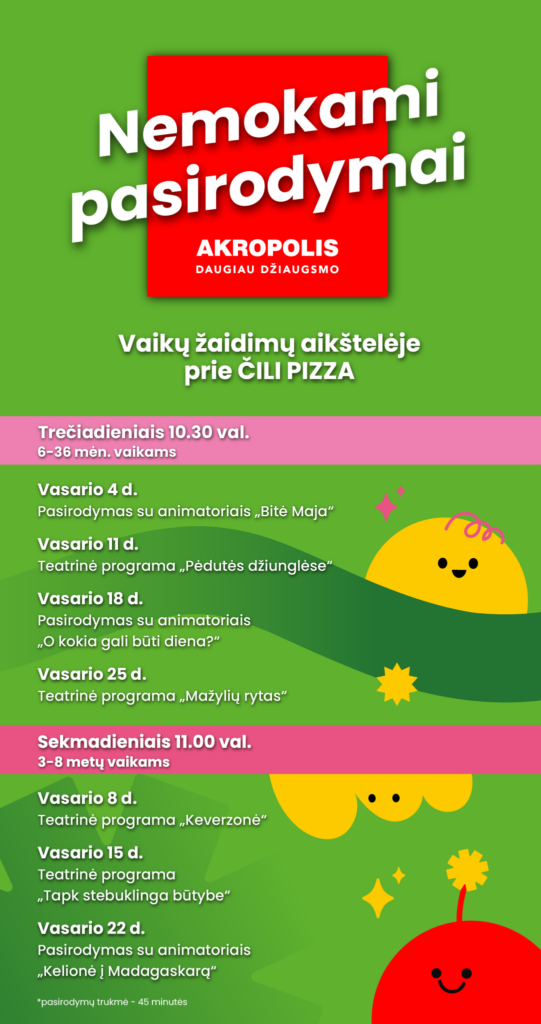 Nuotraukoje ir (ar) vaizdo įraše gali būti užfiksuotas Jūsų (Jūsų vaiko) atvaizdas, kurį PPC AKROPOLIS gali naudoti viešai komunikacijai, įskaitant paskelbti AKROPOLIS interneto svetainėje, socialinių tinklų paskyrose ir/ar kituose viešuose pranešimuose. Daugiau apie asmens duomenų tvarkymą www.akropolis.lt
