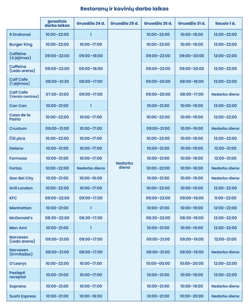 2. Žiūrėti restoranų darbo laiko lentelę žemiau