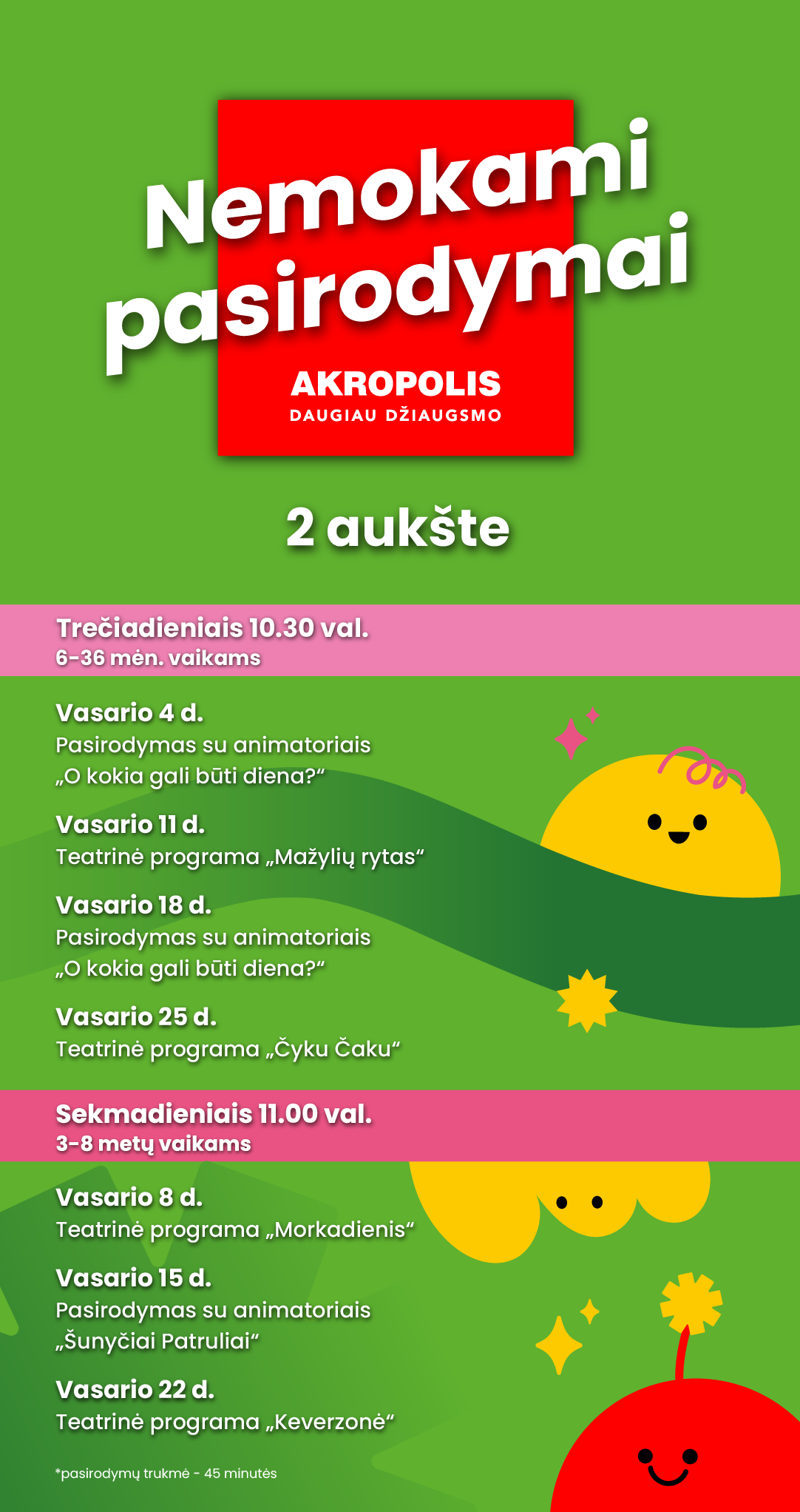 Nuotraukoje ir (ar) vaizdo įraše gali būti užfiksuotas Jūsų (Jūsų vaiko) atvaizdas, kurį PPC AKROPOLIS gali naudoti viešai komunikacijai, įskaitant paskelbti AKROPOLIS interneto svetainėje, socialinių tinklų paskyrose ir/ar kituose viešuose pranešimuose. Daugiau apie asmens duomenų tvarkymą www.akropolis.lt